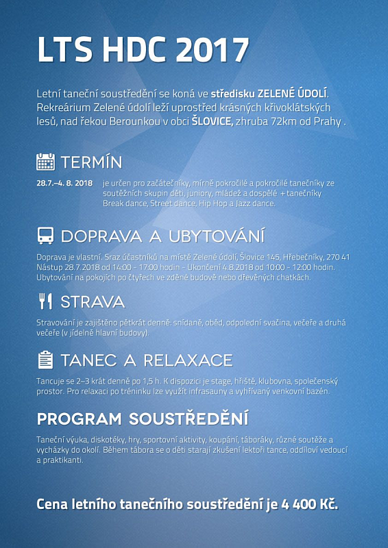 https://www.hdc.cz/stahnout/0f7981b57f3ad78f440f826b3a5699a2/Letní taneční soustředění HDC se koná ve středisku ZELENÉ ÚDOLÍ. Rekreárium Zelené údolí leží uprostřed krásných křivoklátských lesů, nad řekou Berounkou v obci ŠLOVICE, zhruba 72km od Prahy.