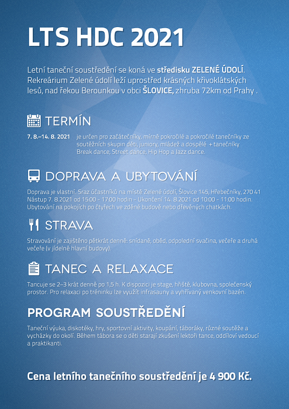 Letní taneční soustředění HDC se koná ve středisku ZELENÉ ÚDOLÍ. Rekreárium Zelené údolí leží uprostřed krásných křivoklátských lesů, nad řekou Berounkou v obci ŠLOVICE, zhruba 72km od Prahy.