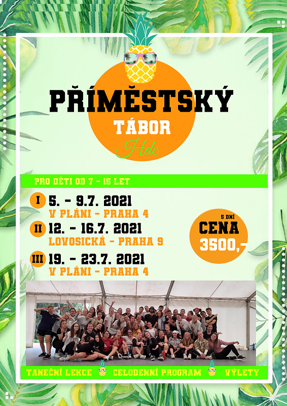 Letní příměstské tábory HDC se konají v našich centrech a v různých termínech. TERMÍNY A MÍSTA KONÁNÍ: 5. - 9.7.2021 - V Pláni 585/8, Praha 4 PRO KOHO JE PŘÍMĚSTSKÝ TÁBOR URČEN : PŘEDŠKOLÁCI DĚTI : 7 - 12 let JUNIOŘI : 12 - 17 let Příměstský tábor je určen pro začátečníky, mírně pokročilé a pokročilé tanečníky. Lekce budou rozděleny podle věku, popřípadě podle pokročilosti. LEKTOŘI: Vyučovat budou lektoři HDC - Michaela Kůstková, Tereza Humlová, Veronika Nekužová, Johanka Nejedlová a další z našeho HDC lektorského teamu. HARMONOGRAM / STRAVA: Příchod dětí každý den v čase od 8:30 - 9:00 Odchod dětí každý den nejpozději v čase 17:00 Každý turnus je 5ti denní od pondělí do pátku Děti budou mít zajištěno : 2x svačinu a oběd CO NÁS ČEKÁ: Taneční lekce - 1x - 2x denně / 60 minut. Edukační lekce jednotlivých stylů, individuální přístup, zdokonalování techniky stylů jednotlivců Dopolední nebo odpolední program kreativního vyrábění. Výlety do přírody, návštěva zoologické zahrady, koupání a mnoho dalších aktivit. Podrobný harmonogram bude upřesněn 14 dní před začátkem tábora. Závěrečné taneční vystoupení pro rodiče. CENA : Cena příměstského tábora je 3 500,- Kč ( 5 dní ) V ceně jsou zahrnuty : Taneční lekce - 1x - 2x denně / 60 minut Stravování ( 10x svačina, 5x oběd ) Po domluvě je možné se zúčastnit pouze jednotlivých dní - Cena 850,- / den Pro uskutečnění příměstského tábora je nutno naplnit minimální kapacitu 15 dětí. Poučení pro rodiče • Přihlášku zadejte online na www.hdc.cz co nejdříve. Počet míst je omezen.