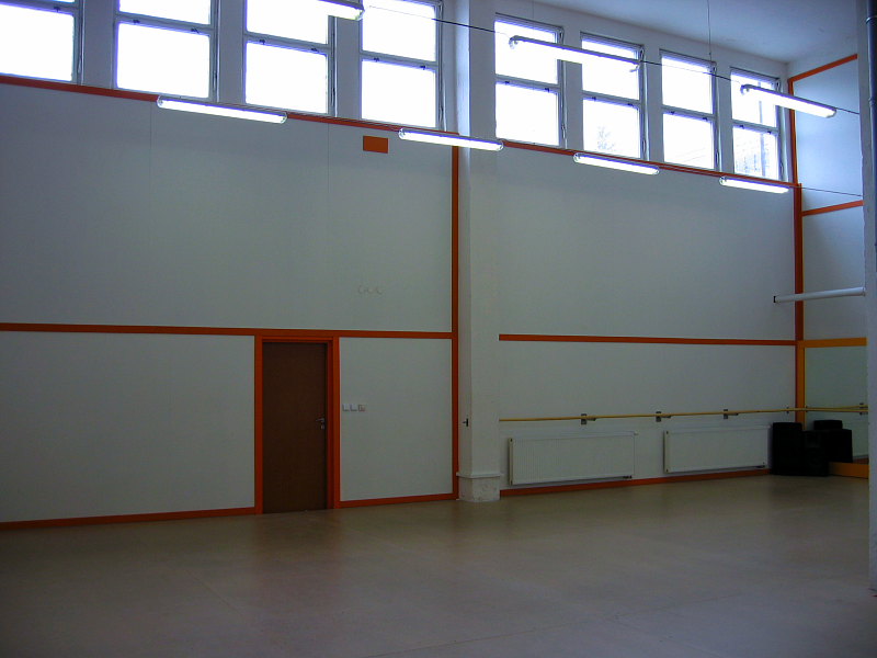 Taneční sál je světlý v bílé barvě lemován oranžovými doplňky, které vytváří pracovní náladu.